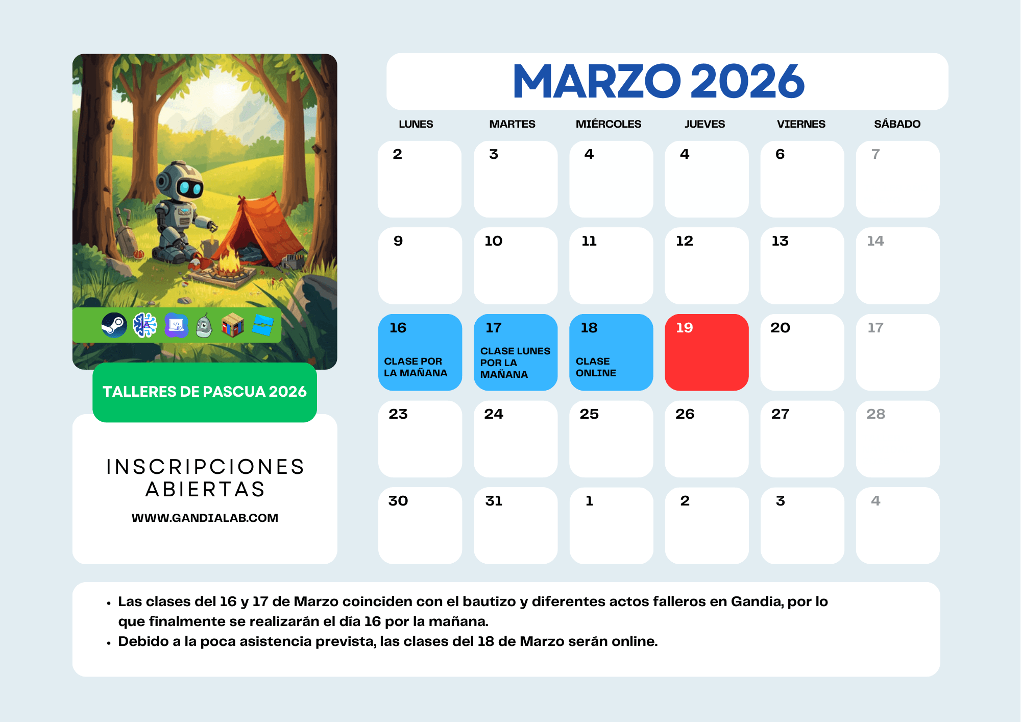 07abr(abr 7)9:00 am10(abr 10)1:00 pmEscoleta de Pascua 2026Actividades de Robótica y Programación en Escuela de Pascua.Tipo de EventoEscoletas Vacacionales,Programación,Robótica